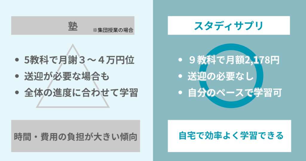スタディサプリは、塾と比べるとお金も時間もかからず、効率が良い学習方法と言えます。