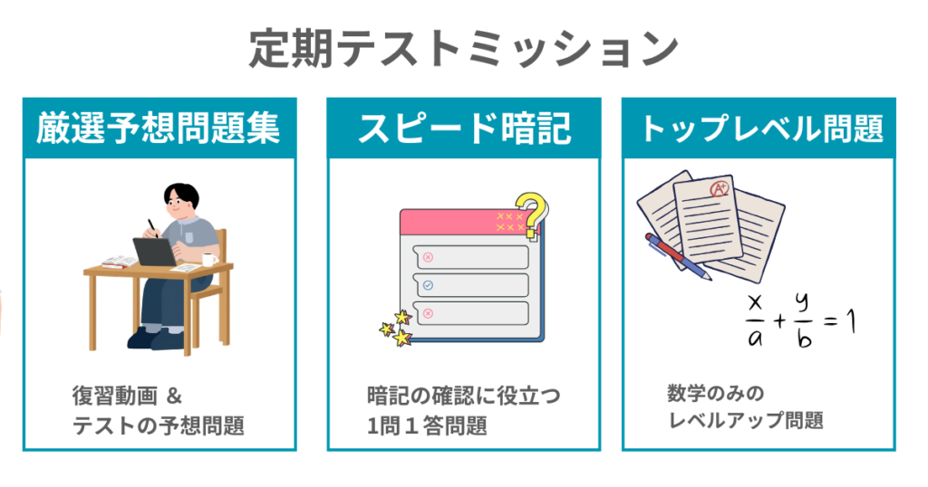 テストの2~3週間前に出題範囲を入力すると、自動で「定期テストミッション」が作成され、やるべき内容が確認できます。